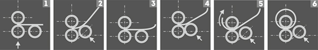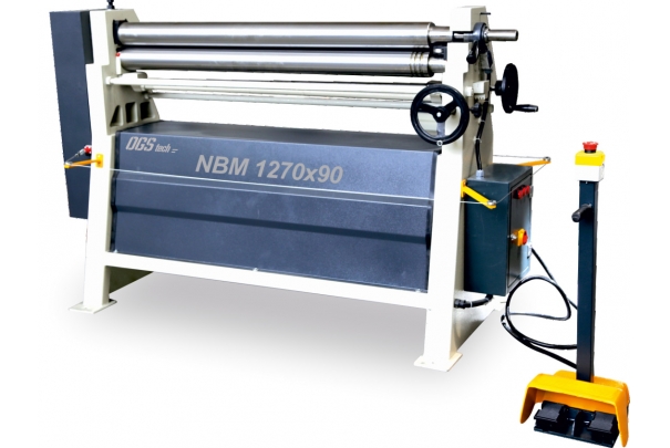 Гибка осуществляется при помощи подачи и вращения верхнего, нижнего и заднего валов. Приводным является нижний вал. Задний вал отвечает за настройку на размер. Верхний формирует заданный диаметр. Область применения: гибка воздуховодов, дымоходов, водосточных систем, элементов сельхозтехники, емкостей и т.д.. Вальцовочные машины NBM обладают возможностью гибки конусов, верхний вал оснащён ручной откидной опорой для удобства снятия изготовленных деталей. Два вала приводятся в действие электрическим приводом с прямым редуктором и системой шестерен (NBM). Благодаря удобной системе регулировки вальцев с одной стороны достигается значительное увеличение производительности труда.